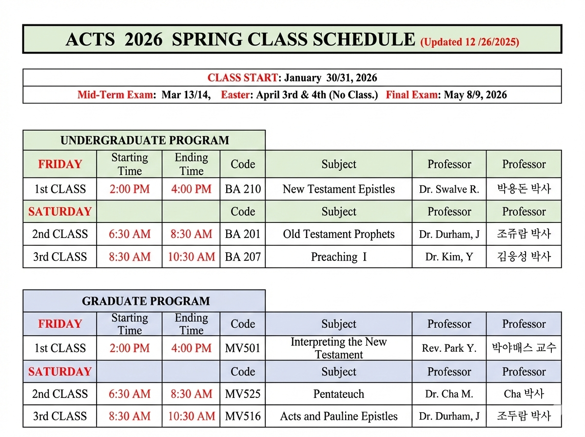 Class Schedule 2026 Spring